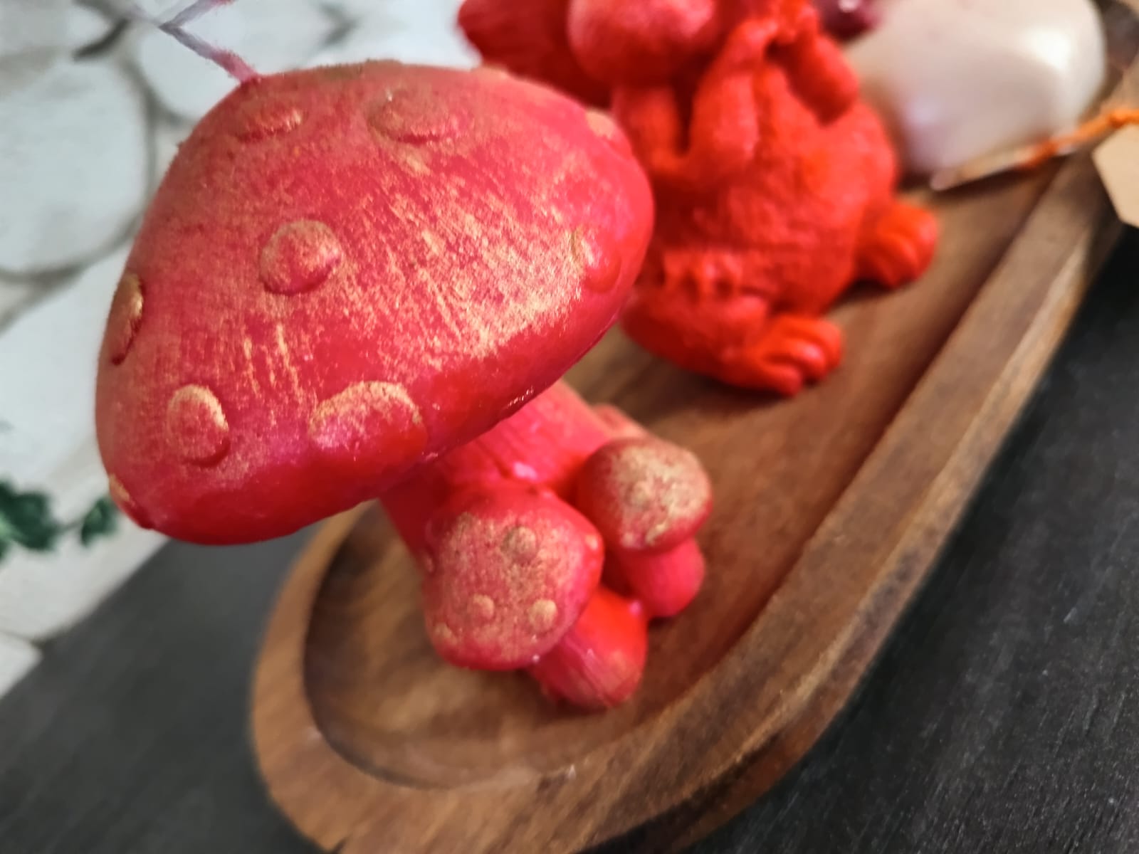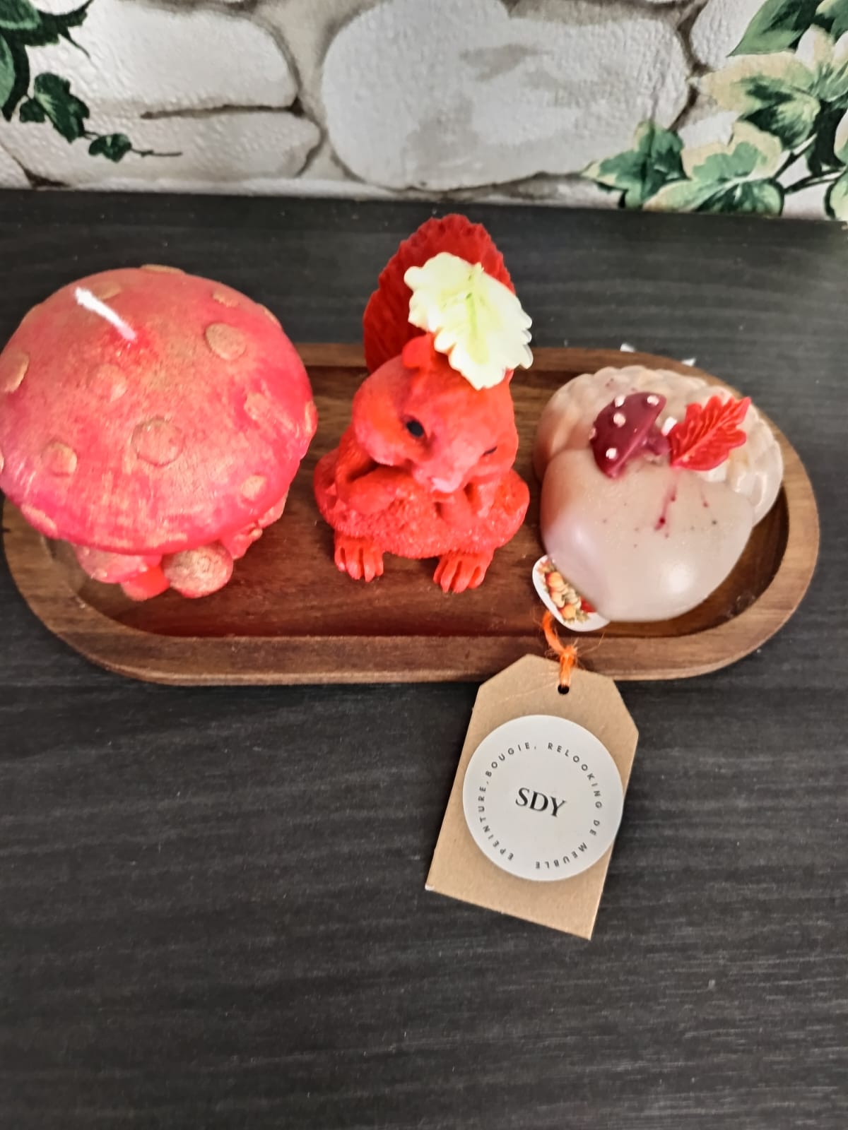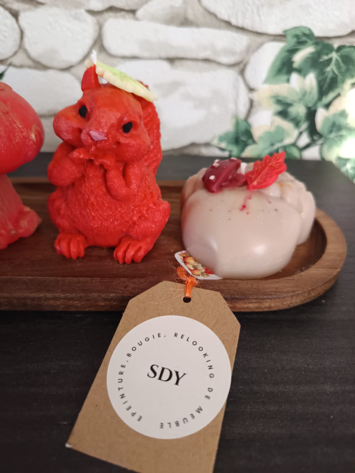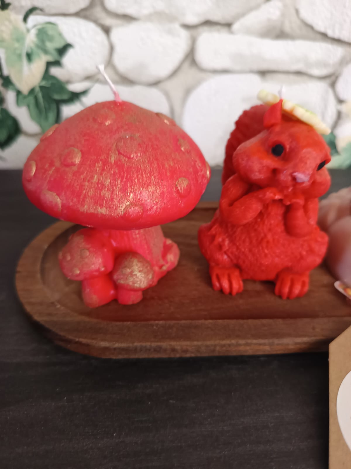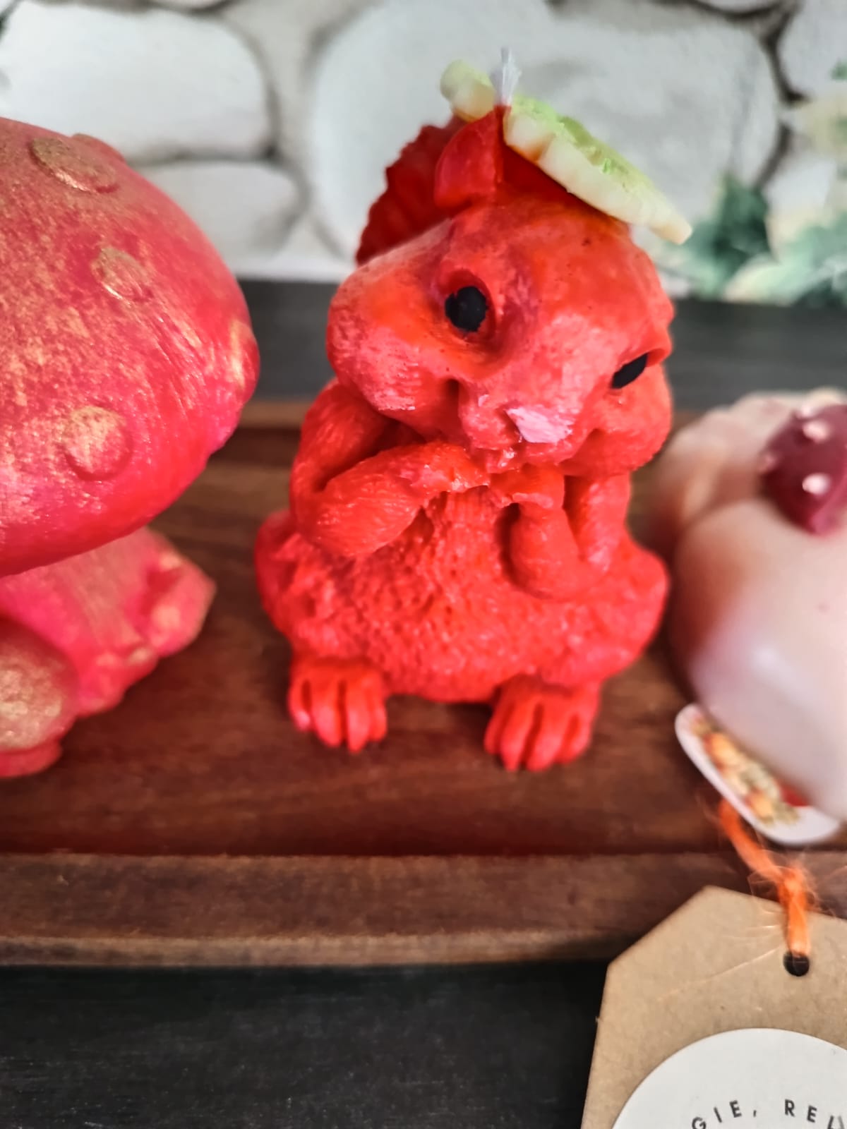 Au centre de cette composition, un magnifique écureuil en cire d’olive attire tous les regards. Sa belle taille et son design délicat ajoutent une note ludique et originale à l’ensemble. A ses cotés la bougie gland et le champignon décore parfaitement cette composition, également en cire d’olive.