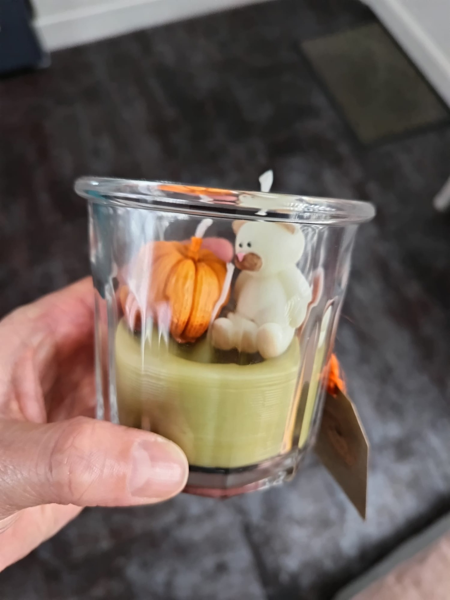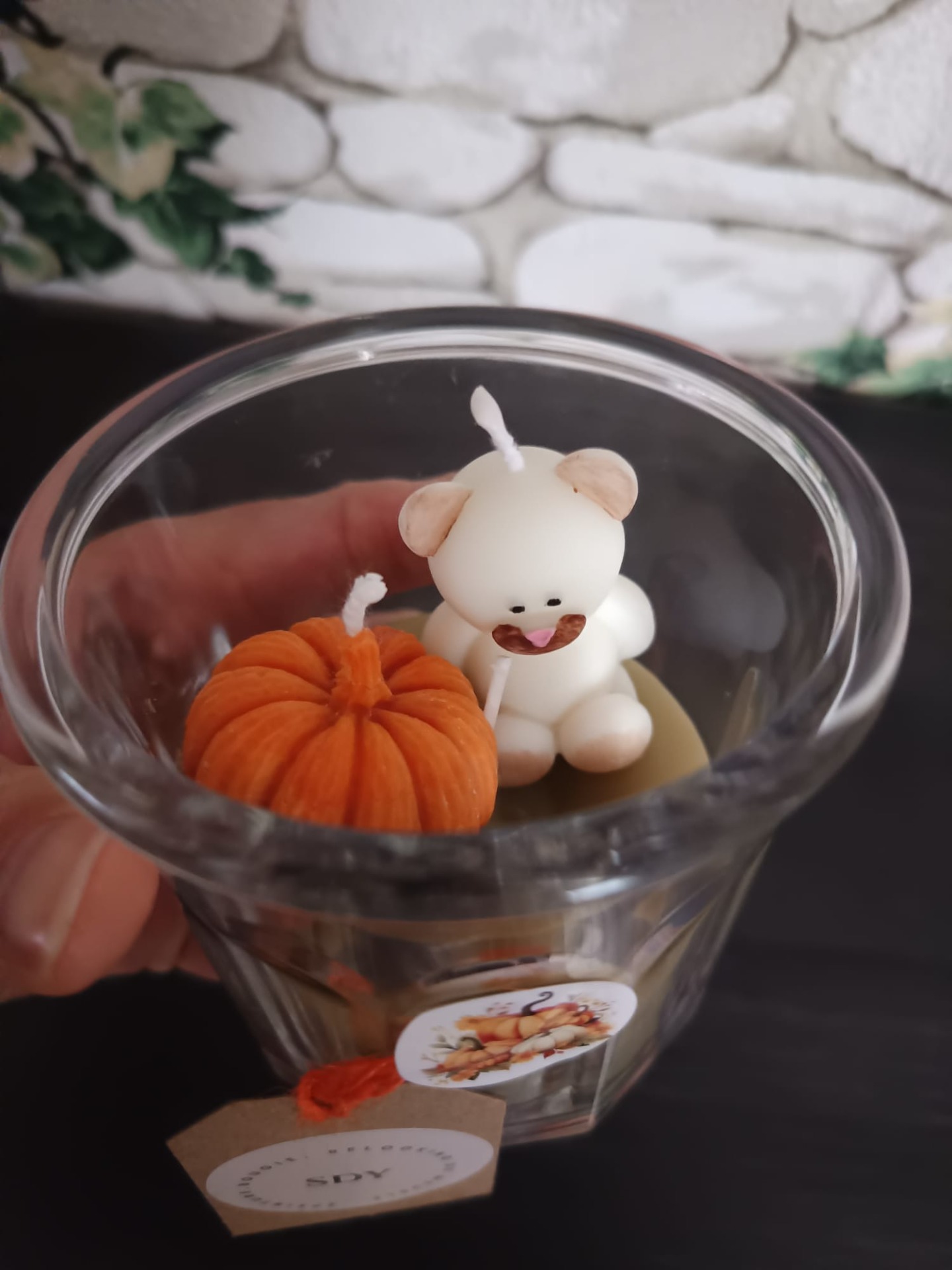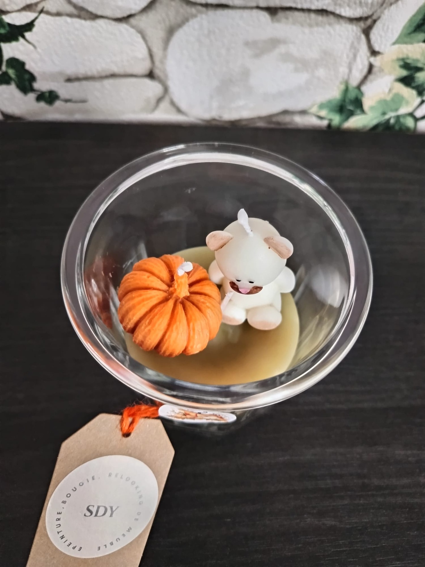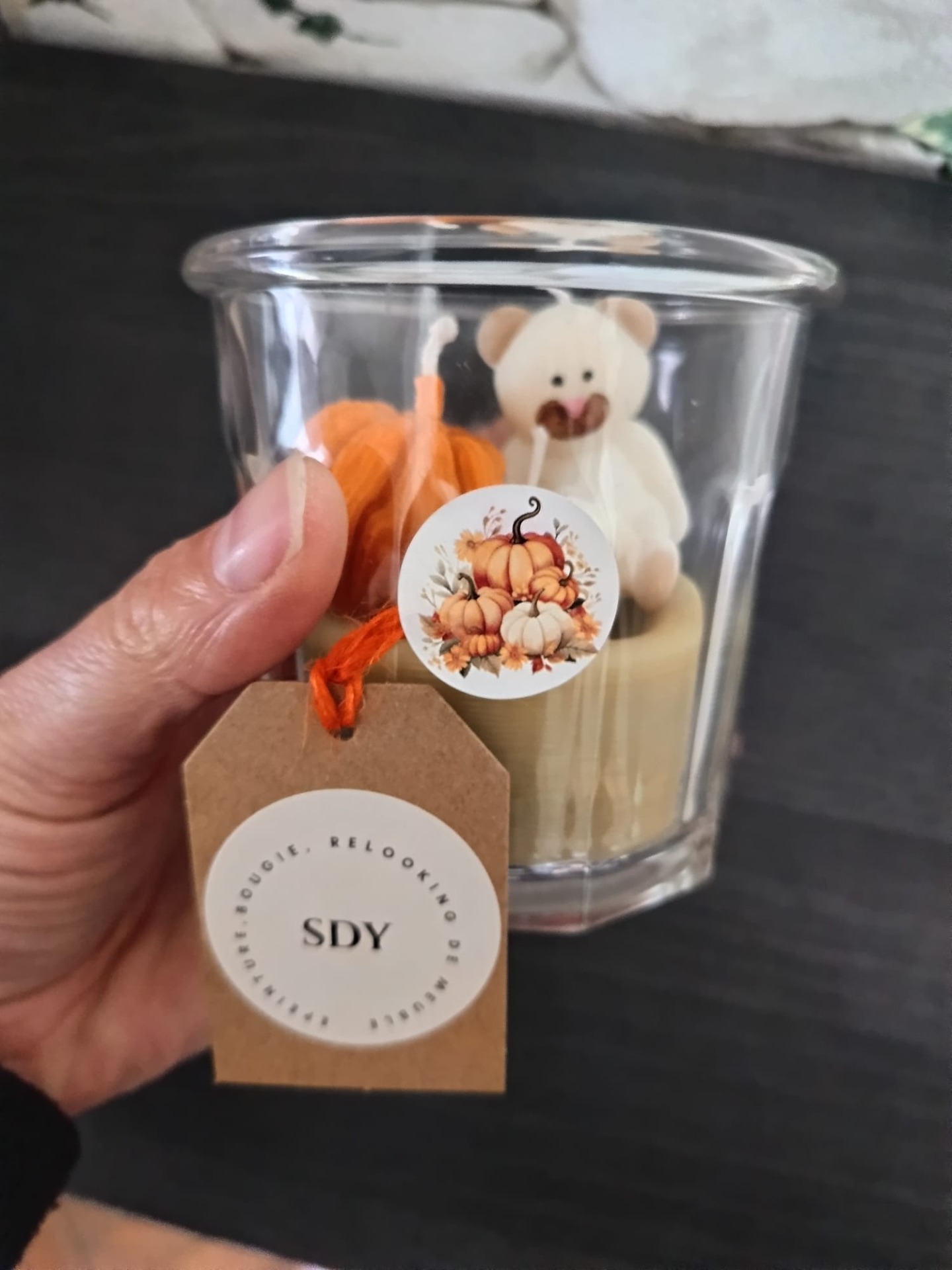 Découvrez notre adorable bougie nounours blanc, accompagnée de sa petite citrouille orange, présentée dans un élégant pot en verre de 8,5 cm de hauteur. Fabriquée à la main en cire d'olive, cette bougie ajoute une touche de douceur à votre décoration.