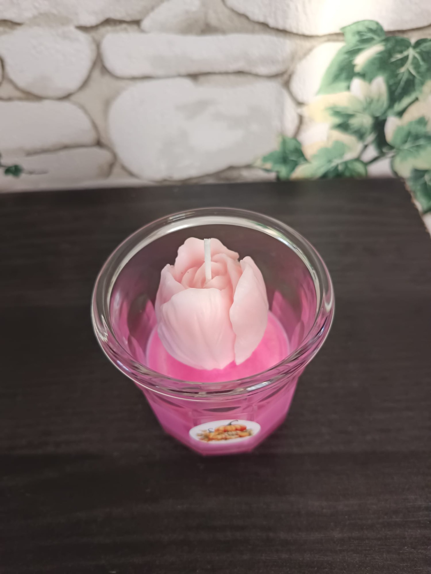 Bougie Tulipe dans son verre, couleur rose, odeur à la rose.