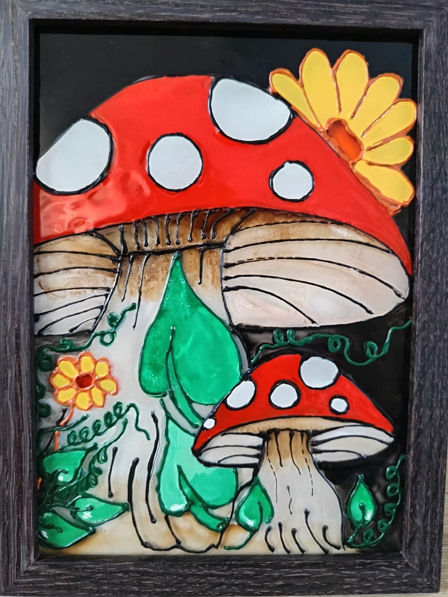 Cadre décoratif, peinture sur verre, Fait main, motif "Champignon"