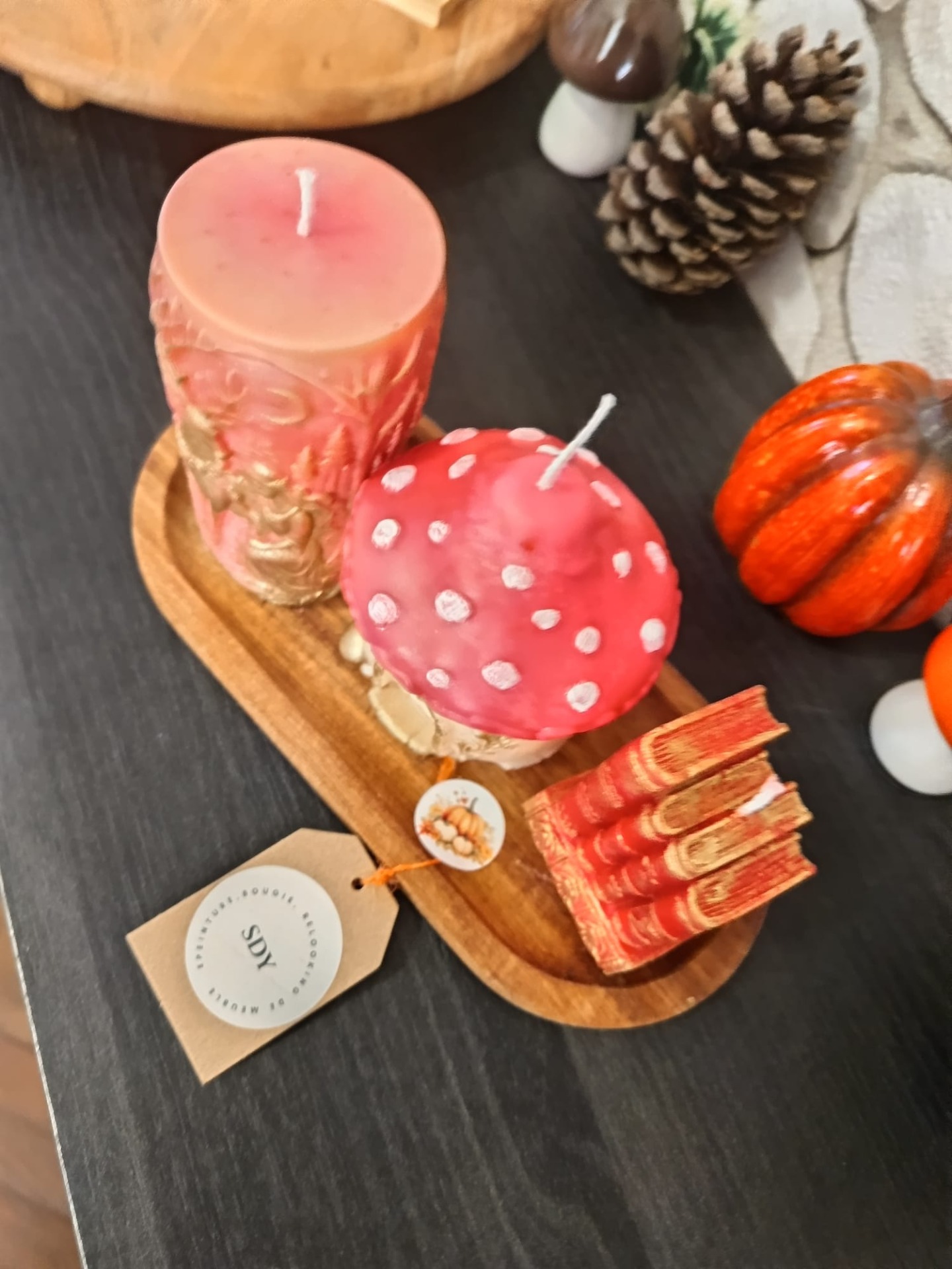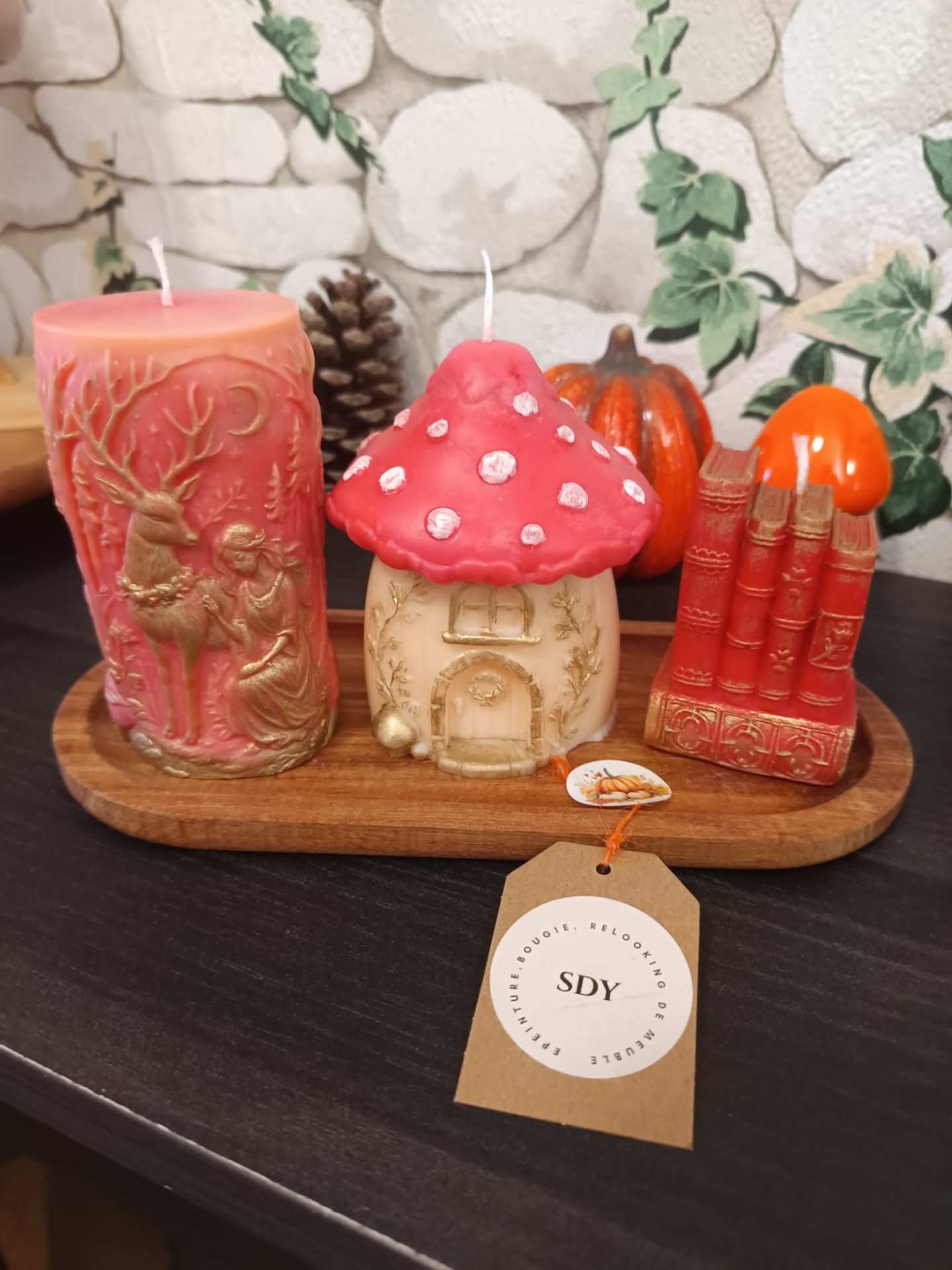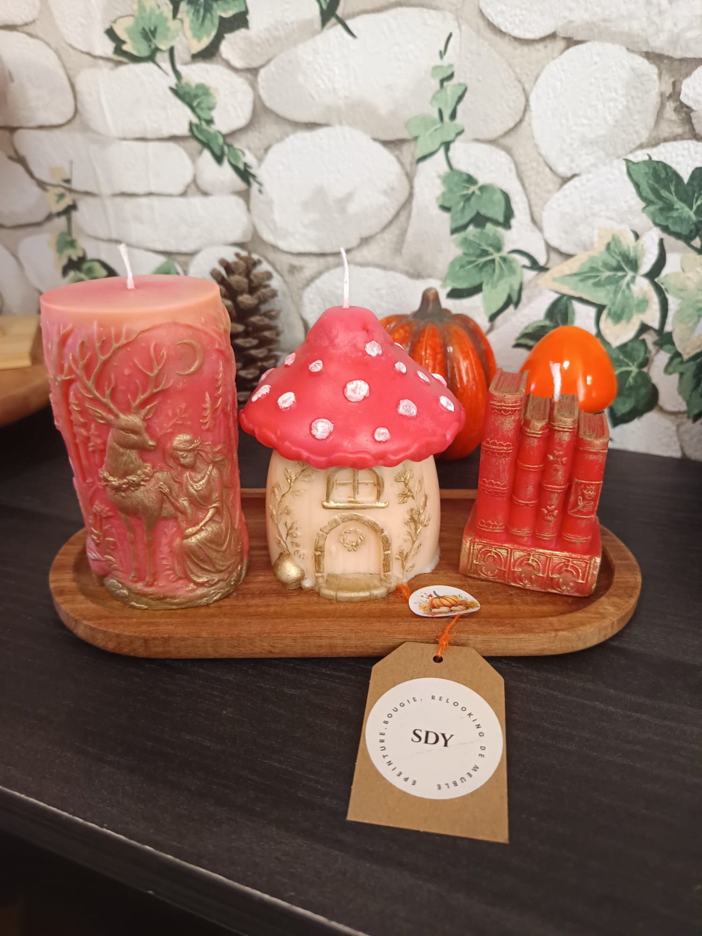 Découvrez cet ensemble enchanteur de trois bougies artisanales, soigneusement réalisées à la main, qui apportent une touche de magie et de chaleur à votre intérieur. Présentées sur un élégant plateau en bois, ces bougies sont parfaites pour créer une ambiance cocooning pendant la saison automnale.