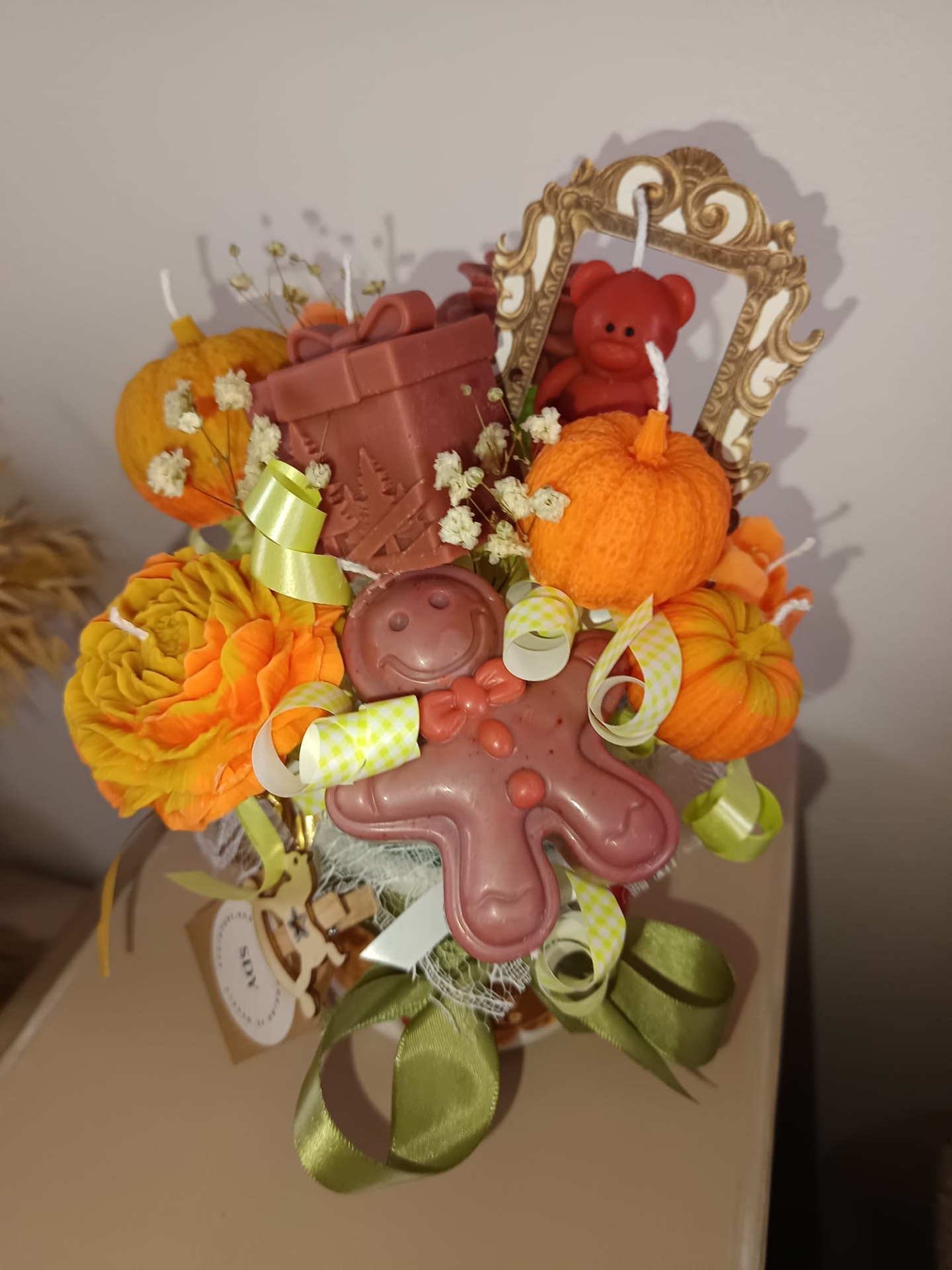 Composition Automnale en Cire de Soja - Bougie Citrouille & Fleurs et Petit Biscuit