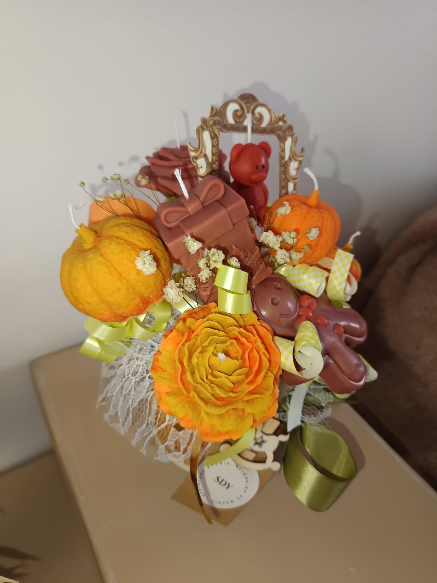 “Douceur Automnale : Composition Festive de Bougie Citrouille et Fleurs et Petit Biscuit”