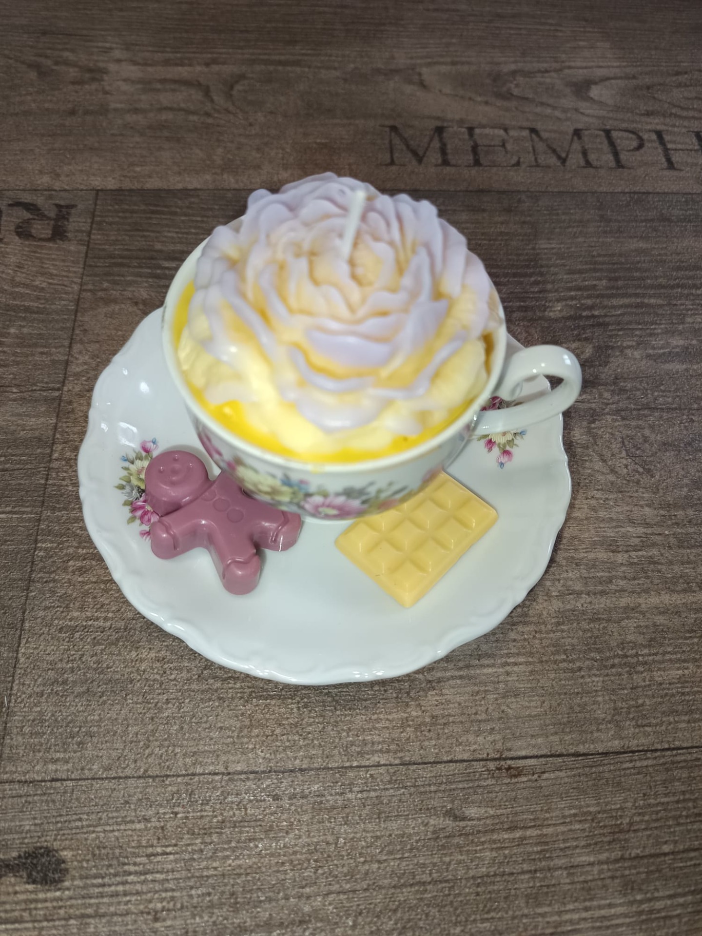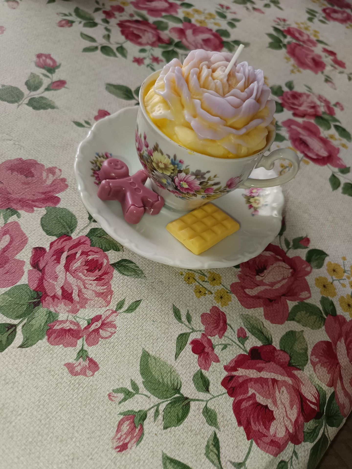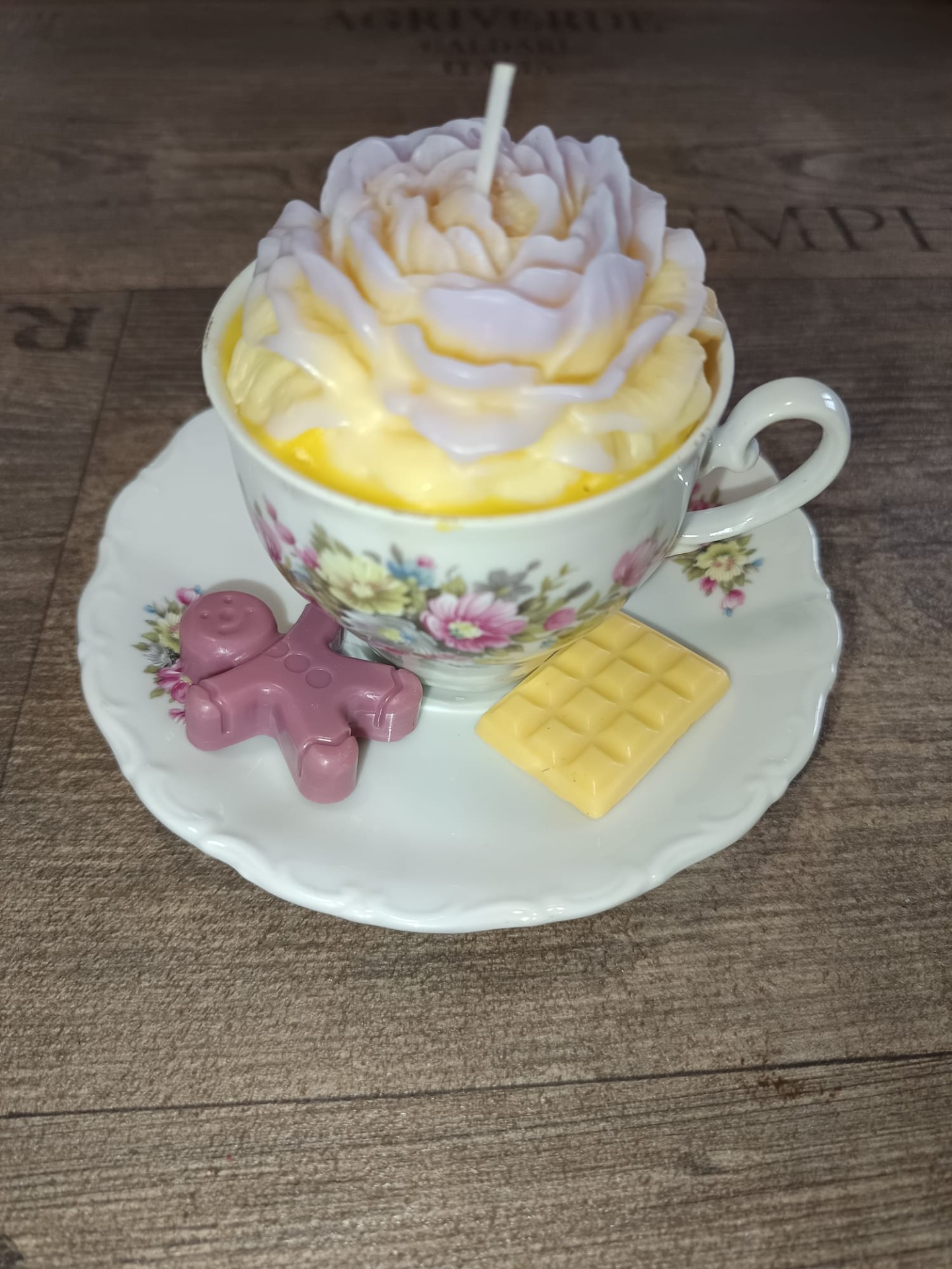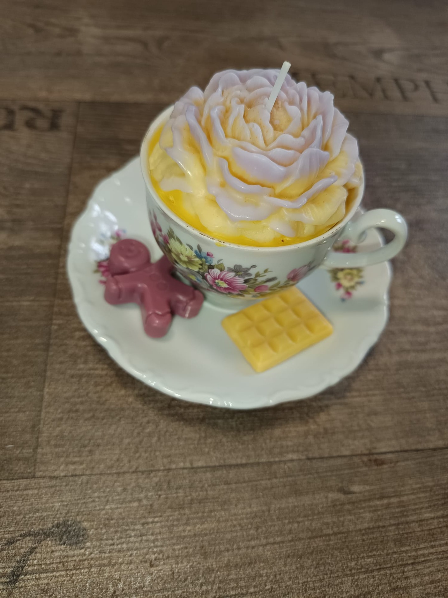 Bougie "Tasse Vintage – Pivoine Violine & Jaune" et ses deux fondants
