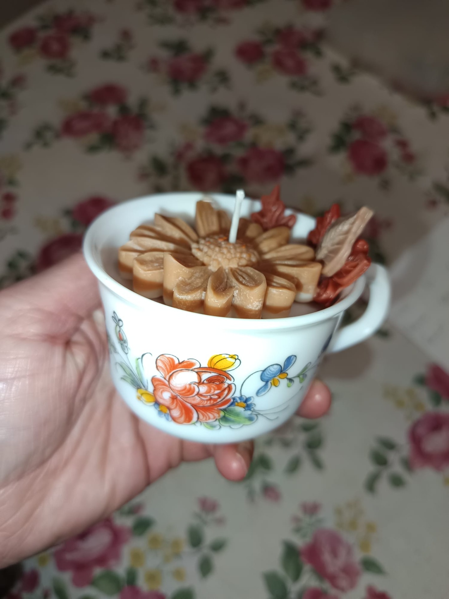 Dans une tasse vintage fleurie, une bougie parfum vanille, coulée à la main, révèle un décor poétique : une marguerite beige–marron aux teintes d'automne, accompagnée de feuilles en cire d'olive sculptées avec finesse.