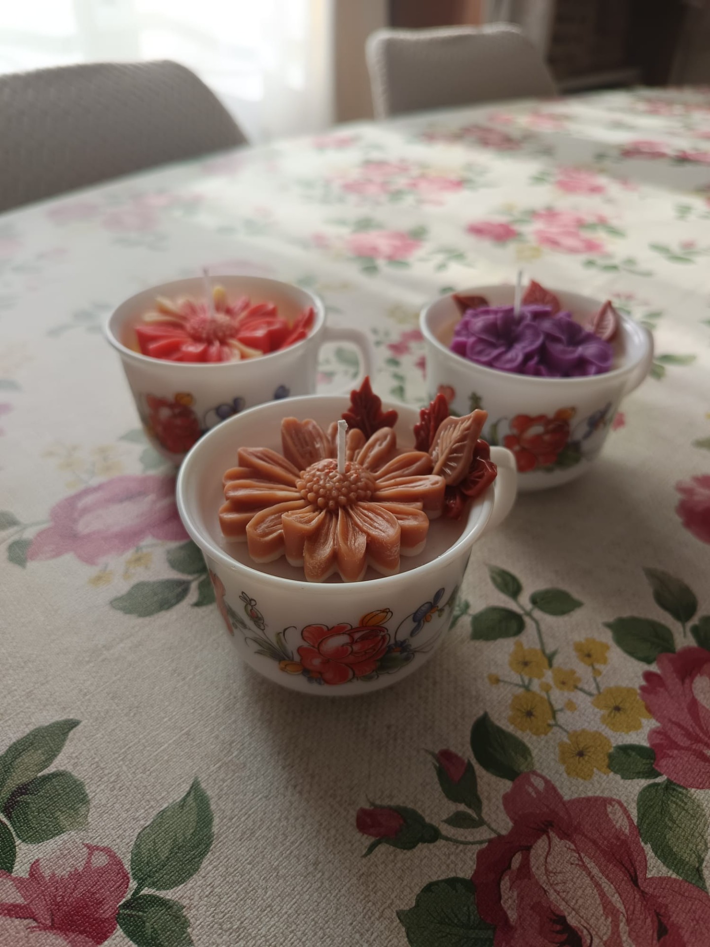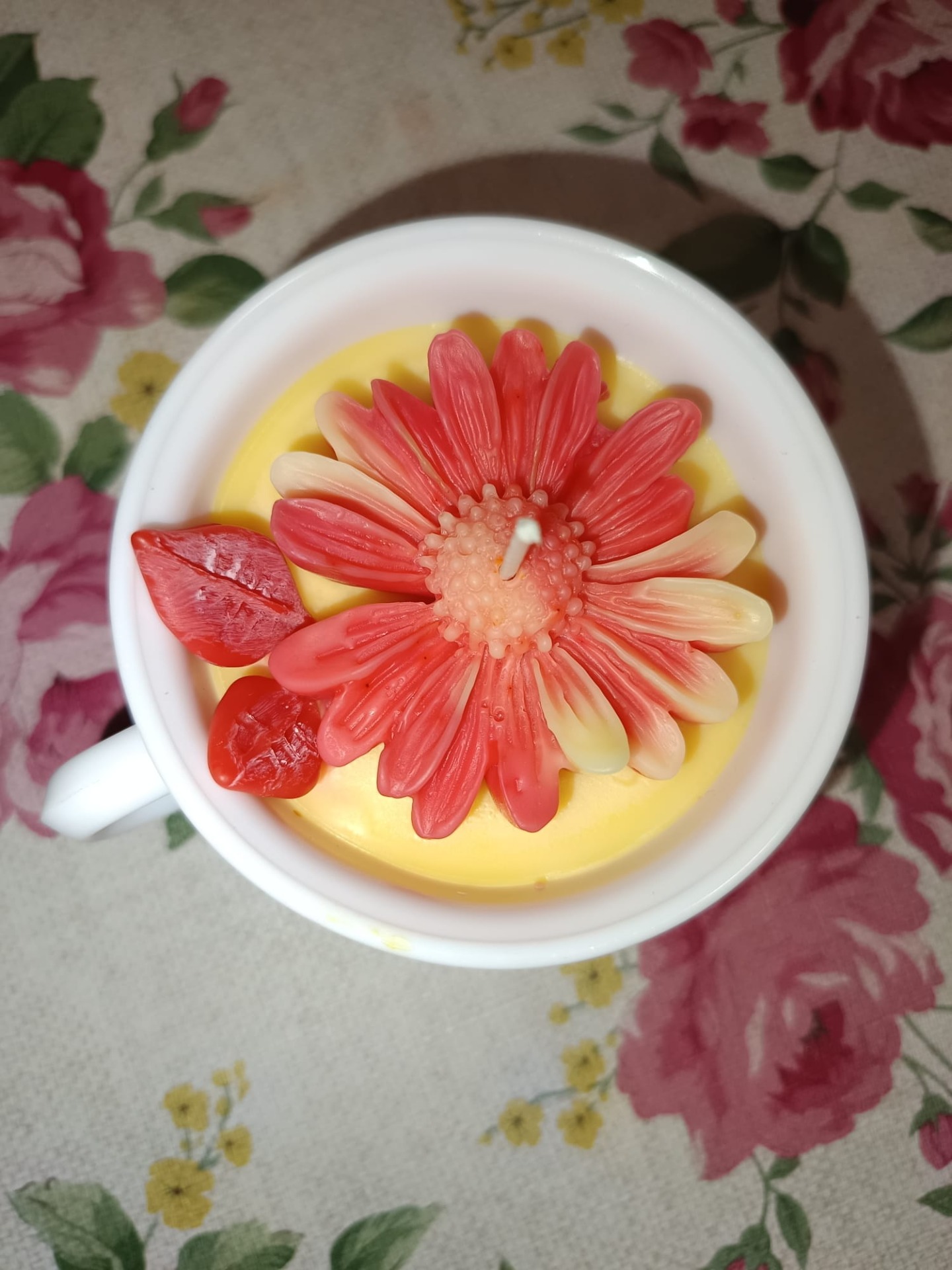 Dans une tasse vintage fleurie, une bougie vanille faite main est coulée avec soin, puis décorée d'une marguerite corail-orangée en cire et de feuilles en cire d'olive minutieusement façonnées.