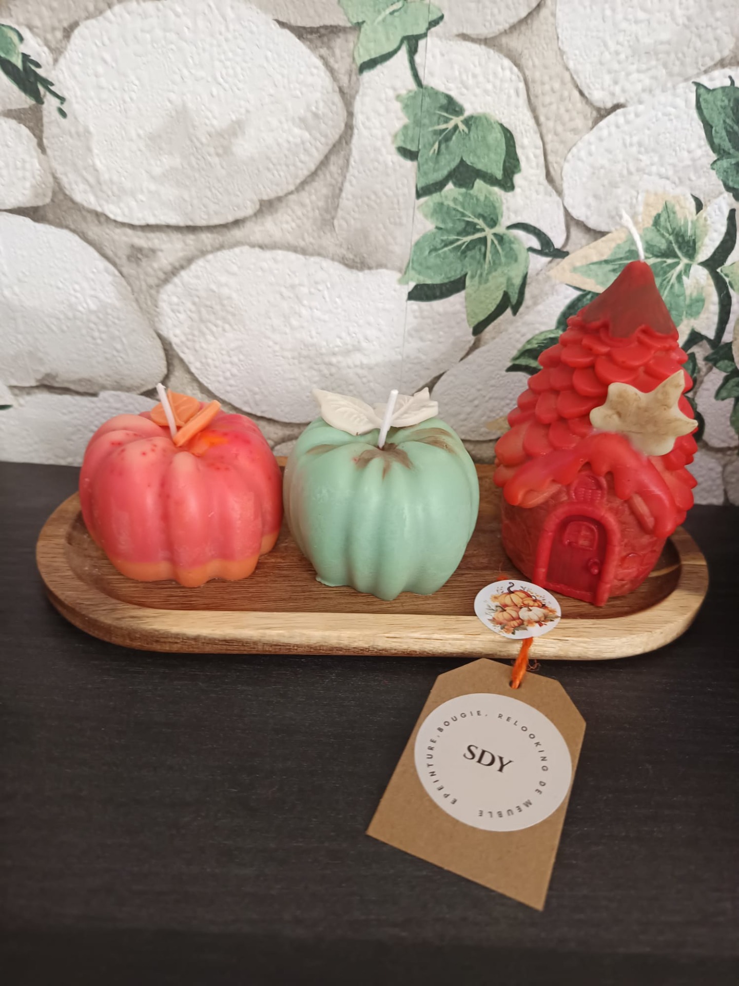 "Découvrez notre collection unique alliant bougies décoratives d'automne, meubles anciens relookés et cadres peints à la main en verre, pour créer une ambiance chaleureuse et élégante dans votre intérieur."