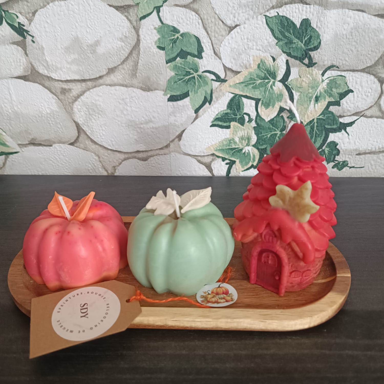 Lot de 3 bougies sur socle en bois décoratif , odeur "tarte à la citrouille"