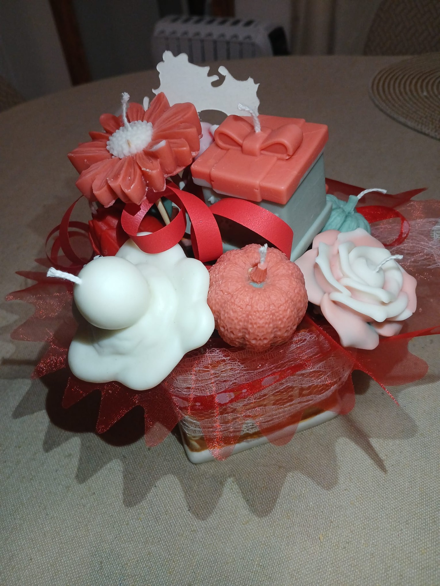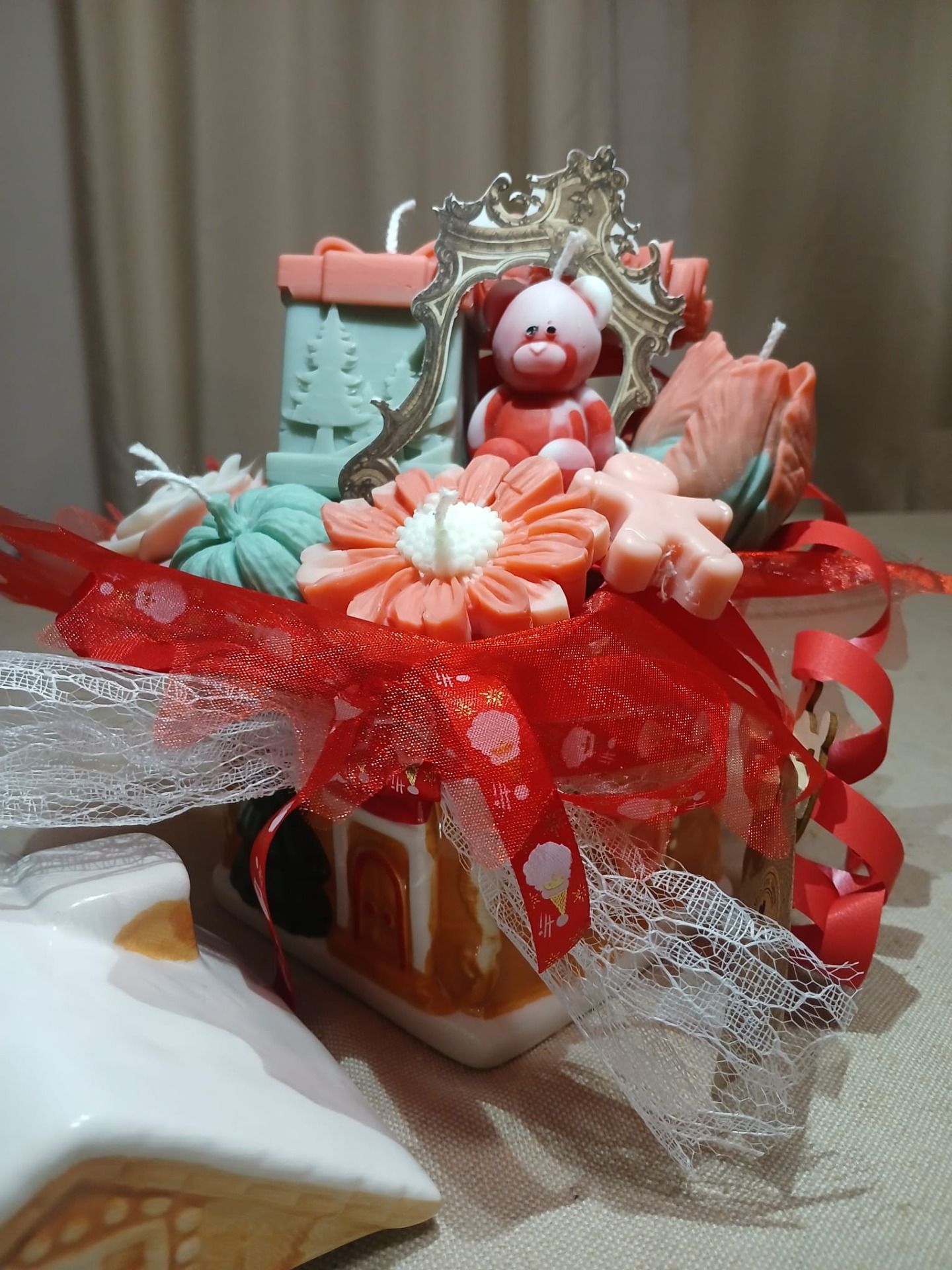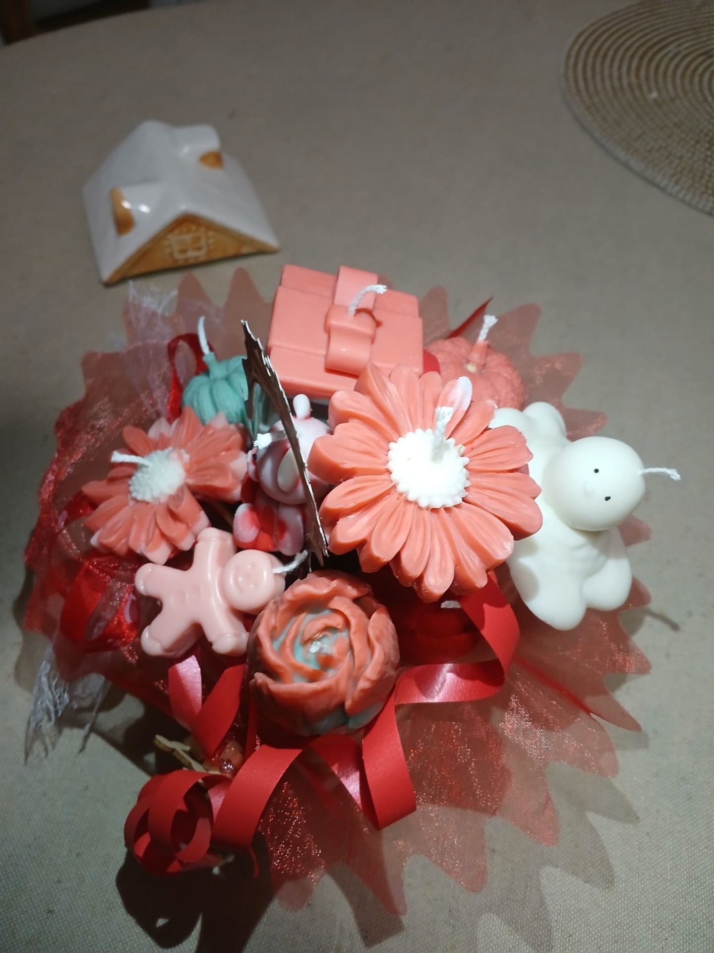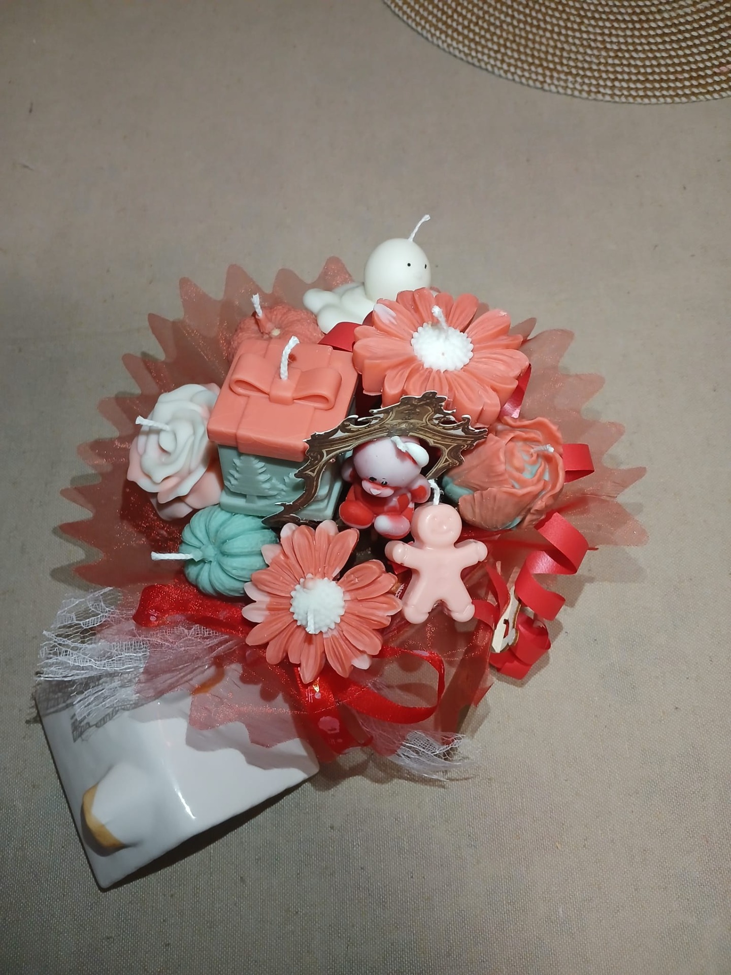 Composition Bougie de Noël - Bonhomme de Neige Nounours Bi-Colore et Fleurs